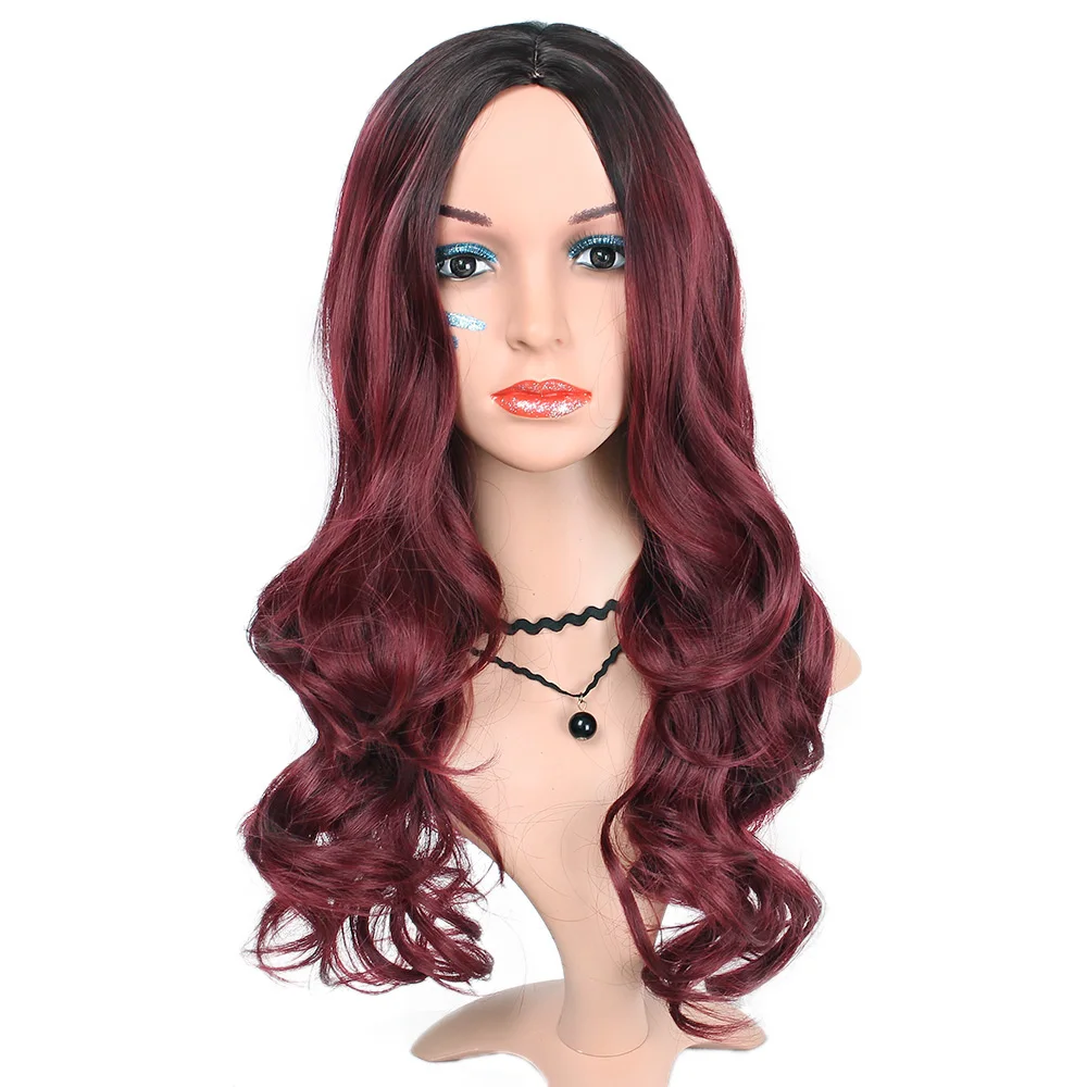 Hot Sale Stamped Glorious 24inches Wave Wig Ombre Black Red Wig Synthetic Long Wig for Women Middle Part Hea